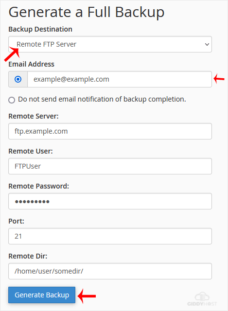 5. Once you fill in the Remote FTP details, click on Generate Backup.
