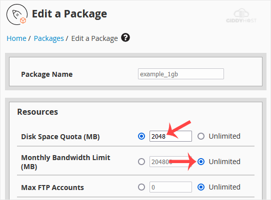4. Under Edit a Package, you can modify resources like disk space, bandwidth, etc.